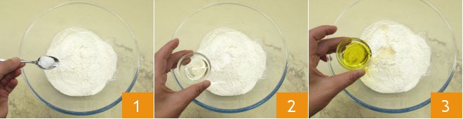 To prepare the burek, start with the phyllo dough: in a bowl, pour the flour, salt 1, vinegar 2, and oil 3.