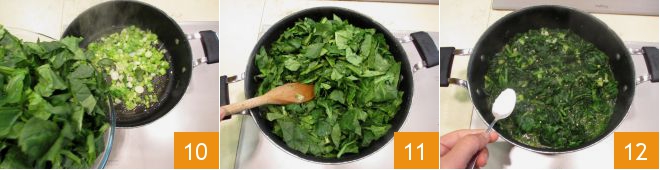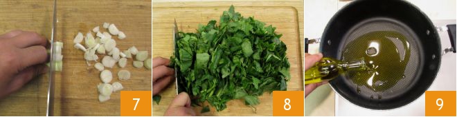 Slice the spring onion 7, wash and chop the spinach as well 8. In a large pan, heat the oil 9 and sauté the spring onion for a few moments.