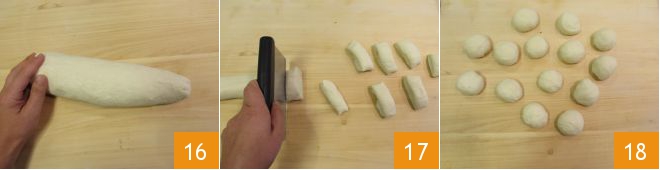 Now take the phyllo dough and roll it out with your hands to form a log 16, divide it with a dough cutter into 14 equal pieces 17, and roll them into balls 18.