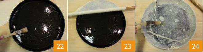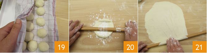 Keep the balls in a cloth to prevent them from drying out 19 and work on them one at a time. Roll out the balls with a little cornstarch using a thin rolling pin 20, the pastry should be very thin, almost transparent 21.