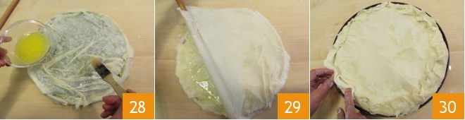 Continue by laying out the remaining sheets, always brushing the surface with melted butter 28. Lay the last sheet 29 and fold the edges to seal well 30.