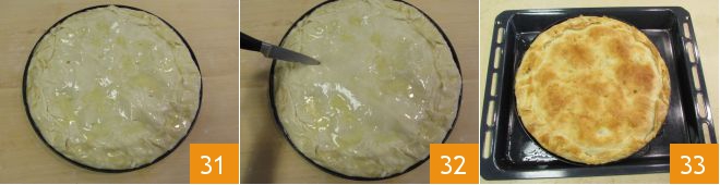 Brush the surface again 31 and make cuts with a knife to let the air out and prevent the pastry from puffing up during baking 32. Bake in a preheated static oven at 392°F for 50 minutes. When done, remove the burek from the oven and let it cool slightly before serving 33.