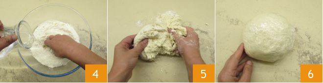 Knead with your hands, gradually adding the water 4. Once all the ingredients are gathered, transfer the dough to a work surface 5 and form a smooth dough ball. Cover with plastic wrap 6 and let it rest at room temperature while you continue with the preparation.