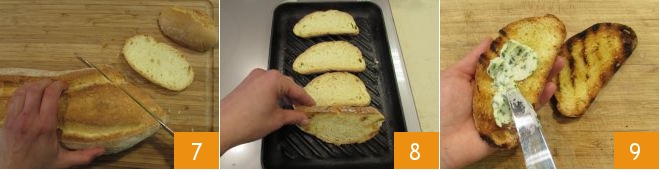 Slice the rustic bread 7, heat a grill and toast the bread 8 until it is golden and crispy. Everything is ready to assemble the toast: take a slice of toasted bread, spread the butter cream on top 9