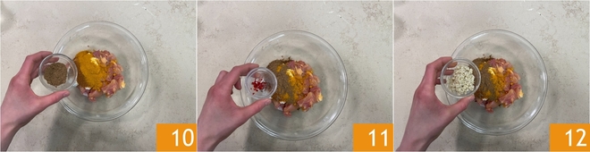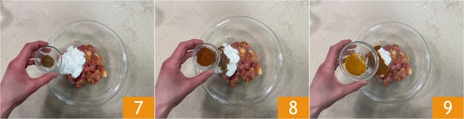 Add the cumin 7, sweet chili powder 8, and turmeric 9.