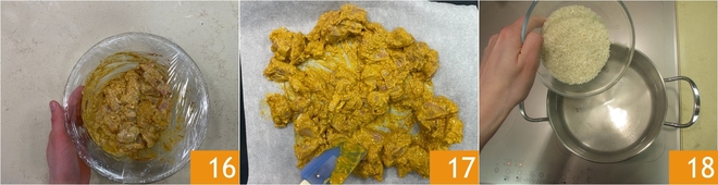 Cover with plastic wrap 16 and refrigerate for at least 30 minutes or up to 34 hours. After this time, preheat the oven to 392°F. Arrange the chicken with its marinade on a baking sheet lined with parchment paper 17 and bake for about 30 minutes, until golden. In the meantime, cook the basmati rice in boiling water 18 and prepare the sauce.