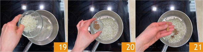 To prepare the Makhani sauce, melt the butter in a saucepan over medium heat. Add the chopped onion 19 and sauté until golden. Add the whole spices (cardamom, star anise, cinnamon, cumin seeds) 20 21 and toast them for 1-2 minutes until they release their aroma.