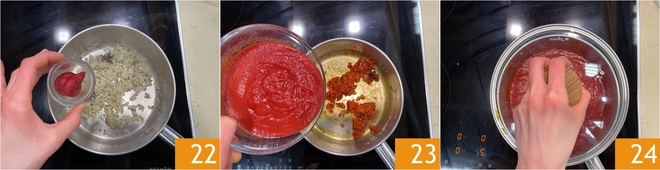 Add the tomato paste 22 and stir. Then add the tomato puree 23 and adjust with salt. If you prefer, you can also add a pinch of sugar. Cover with a lid 34 and simmer over low heat for about 20 minutes, until the sauce thickens.