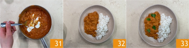 Mix to obtain a creamy consistency 31. Plate the dish by serving the rice with the chicken alongside it 32, and garnish with parsley leaves. Enjoy the butter chicken piping hot! 33!