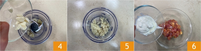Place the ginger and garlic in a blender 4 and blend to obtain a paste 5. Transfer the cubed chicken into a large bowl and add the yogurt 6.