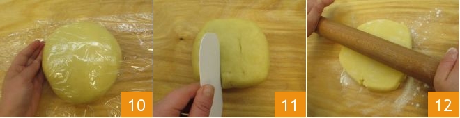 Cover with plastic wrap 10 and let it rest in the refrigerator for at least 2 hours. After the 2 hours, the butter-free pastry is ready to be rolled out. With a dough scraper, cut off 1/3 of the dough 11 and keep it aside covered with plastic wrap. Lightly dust the work surface with flour and roll out the remaining 2/3 of the dough with a rolling pin 12.