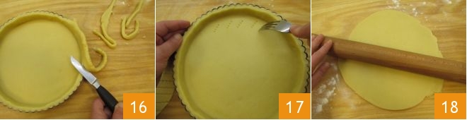 Apply gentle pressure to adhere the bottom and sides, then use a knife to trim off the excess dough from the edge 16. At this point, prick the base of the tart shell with a fork 17. Place the tart pan in the refrigerator, meanwhile take the reserved quarter of dough, roll it out with the rolling pin to a thickness of about 1/8 inch 18.