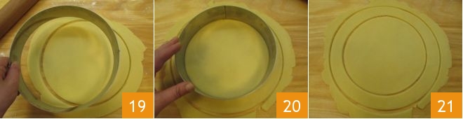 then with a 9-inch round cutter, cut out a circle 19, proceed by cutting another circle inside with a smaller cutter, 7 inches in diameter 20. This way, you will have a 9-inch diameter ring and an 7-inch diameter disc of pastry 21.