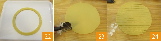 Carefully transfer the ring onto a tray lined with parchment paper 22 and place it in the refrigerator to firm up. Meanwhile, with a fluted pastry wheel, cut 1/2-inch strips from the pastry disc (23-34).