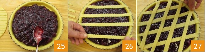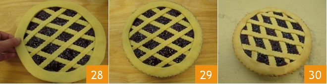 Now retrieve the tart pan and fill the base with jam, taking care to spread it evenly and level the surface with the back of a spoon 25. Once done, apply the strips of dough spaced well apart on the tart, securing the ends to the edge 26; cross the strips to create a diamond pattern 27.
