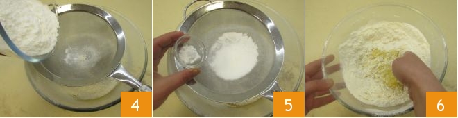 Then, still in the same bowl, sift the flour 4, potato starch and baking powder for desserts 5. Work the ingredients with your hands to combine them 6.