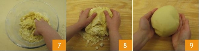 Once you have gathered all the ingredients 7, transfer the dough to a floured surface and knead by hand vigorously 8 until you have obtained a smooth and compact dough that you can shape into a sphere 9.
