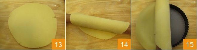 You should get a round sheet about 1/5 inch thick 13. Carefully roll the pastry sheet around the rolling pin 14 and then unroll it onto a 9-inch tart pan 15: if you are using a perforated pan, there will be no need to oil it, otherwise, you can lightly oil the pan before laying out the base.