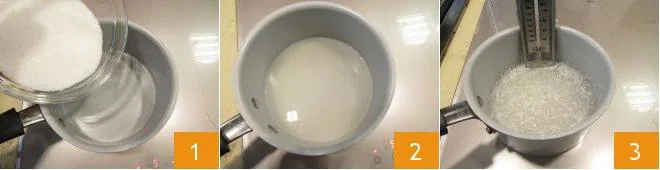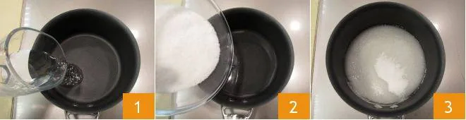 To make the meringue buttercream for decorating desserts (cupcakes and small sweets on which you want to emphasize particular decorations), first make a syrup: pour the water 1 and sugar 2 into a saucepan and heat the mixture 3 until it reaches 250°F.