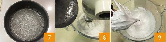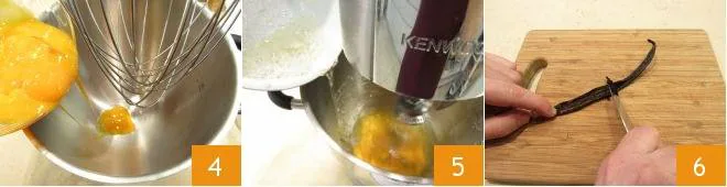 When the syrup is almost at temperature, place the egg yolks in a mixer and start to whip them 4, add the syrup in a thin stream 5, which will have reached the temperature by then, and whip until completely cooled. Meanwhile, cut the vanilla pod and extract the seeds 6.
