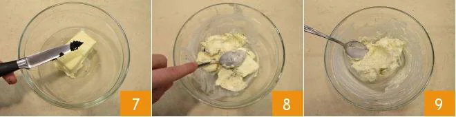 At this point, place the butter in a bowl, add the vanilla seeds 7, and with the help of a spoon start to work it 8, until you get a homogeneous mixture 9.