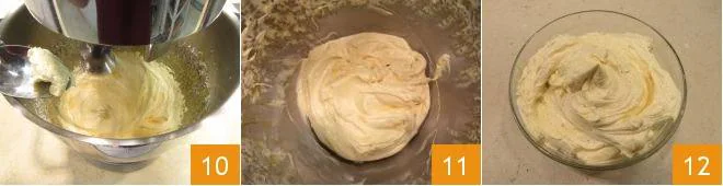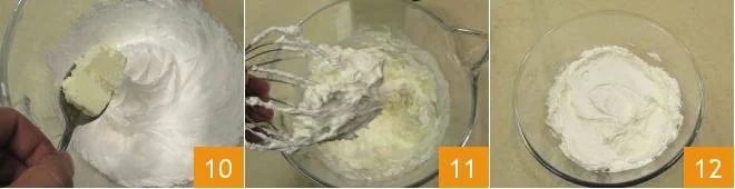 When the meringue is well chilled, add the butter as well, little by little 10 and incorporate it, always working with the whisks 11. Once incorporated, your meringue buttercream is ready to use 12. If you wish, you can color it by adding food coloring at this stage, just enough to achieve the desired shade. Continue mixing until you have a uniform color. Put the buttercream in a piping bag and use it to decorate the surface of small cakes and cupcakes!