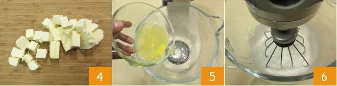 Meanwhile, cut the butter into pieces 4; then pour the egg whites into the bowl of a mixer equipped with a whisk 5 and start whipping 6.