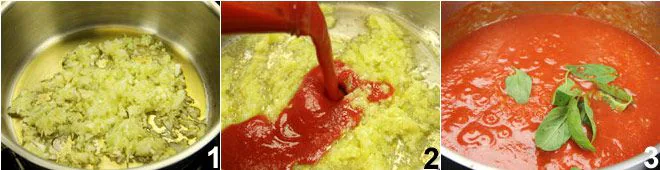 Chop the spring onions and let them soften 1 in 3 tablespoons of extra virgin olive oil over low heat for about 10-15 minutes; add the tomato passata 2, salt, and let cook for about 10 minutes on low heat, then turn off the heat as the tomato sauce should remain fluid and not thick. Add the basil leaves 3, breaking them with your fingers.