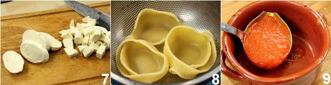 Bring a pot of salted water to a boil and cook the caccavelle for 15 minutes, taking care not to let the boiling become too violent to avoid breaking them during cooking. Meanwhile, cut the mozzarella into cubes not too small 7 (about 0.75 inches per side). Once the caccavelle are drained 8, place them on a plate. Take the 4 small pans in which you will season and then cook the caccavelle, placing a small ladle of tomato sauce 9 on the bottom of each.