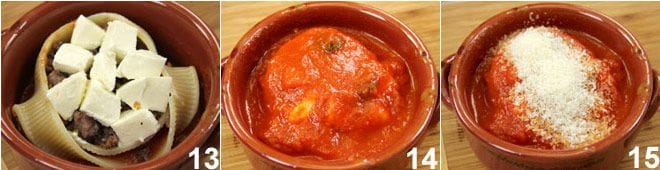 Place the caccavella on top, put a small ladle of tomato sauce inside 10, then 1.75 oz of crumbled ricotta 11 and a quarter of the ragù 12.