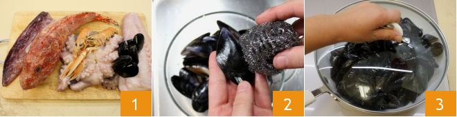 To prepare Livorno-style cacciucco, start by cleaning the fish and shellfish you need: mussels, octopus, squid, cuttlefish, monkfish, scorpionfish, and langoustines 1. Clean and cook the mussels. After washing them under running water, remove all barnacles and pull off the beard emerging from the shell with a strong motion. Then, still under fresh running water, scrub the mussels vigorously using a steel wool pad or a stiff brush 2. Place the cleaned mussels in a pan and cover with a lid 3