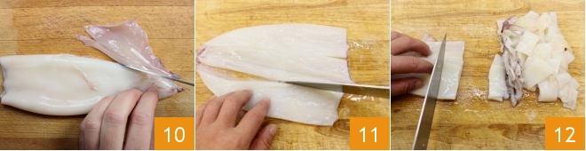 then open the mantles like a book: remove the outer layer 10, cut them into strips 11, and reduce them to slivers 12.