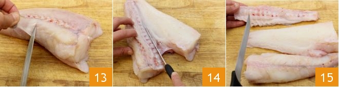 Continue with the monkfish: remove the outer skin 13, divide the flesh following the bone 14, and fillet it 15, keeping the scraps aside.