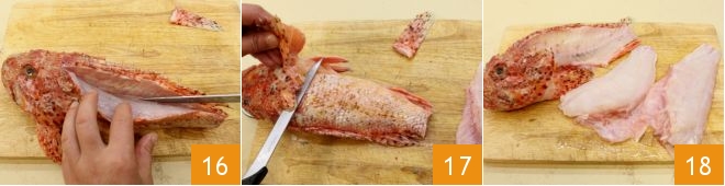 Now scale the scorpionfish, remove the tail, and make an incision along the back 16, then remove the fins 17 and fillet it 18, keeping the scraps aside.
