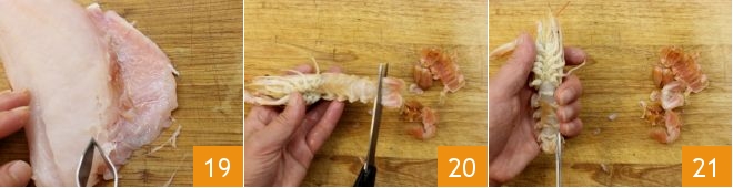 Remove the bones from the fillets with tweezers 19. Finally, clean the langoustines. With scissors, remove the tail 20, the legs 21