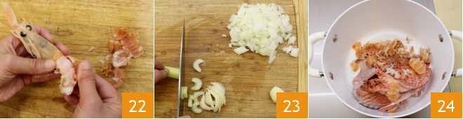 and the carapace 22, leaving the head intact and keeping all the scraps. After cleaning the onion, chop it and the celery, then mince the garlic clove 23. In a pot over moderate heat, place all the scraps: the monkfish bone, scorpionfish tail and fins, langoustine tail, legs, and carapace 34.