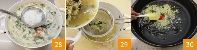 Season with salt and pepper 34, then add the previously crushed peeled tomatoes 35 and 1 cup of the fish broth obtained 36.