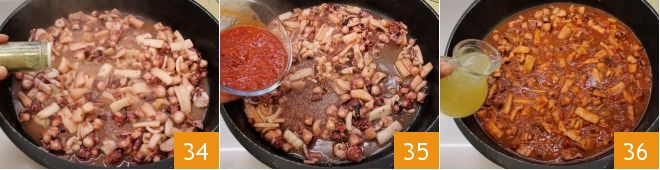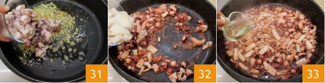 Add the chopped octopus and cook for 10 minutes 31, then add the squid and cuttlefish 32 and continue cooking for another 5 minutes. Deglaze with white wine 33.
