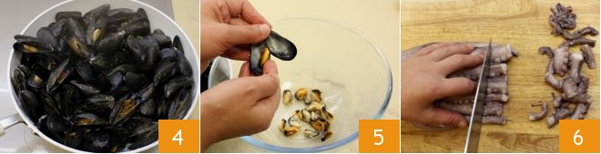 and cook them over high heat for 5 minutes, or until they open 4. At this point, you can shell the mollusks 5, keeping a few whole mussels aside. Move on to the octopus. Clean it according to the tutorial, then coarsely chop the tentacles 6.