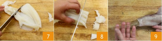 To clean the cuttlefish, you need to gently separate the head and tentacles from the mantle, wash them well, and remove the cartilage pen and the ink sac. Chop the tentacles 7 and heads 8. Proceed with the squid. Once the head is removed, locate the transparent cartilage pen inside the mantle and remove it gently 9,