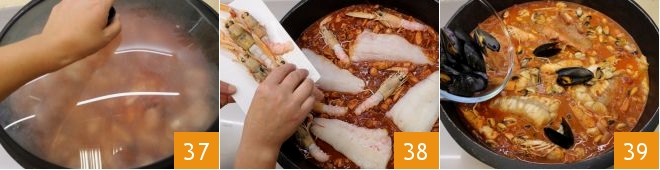 Cover the pan with a lid 37 and let it simmer over low heat for 1 hour and 10 minutes. When the fish is nearly cooked, gently add the monkfish and scorpionfish fillets, then add the langoustines 38. Continue cooking for 10 minutes, adding another 2 cups of broth and keeping the lid on the pan. After this time, add the shelled and whole mussels 39 and cook for the last 10 minutes).