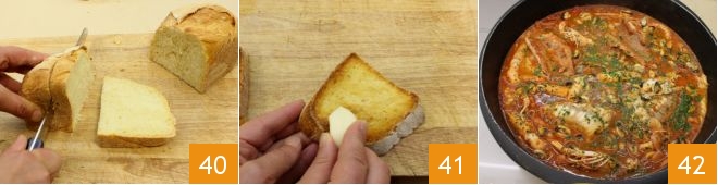 Meanwhile, slice the bread 40 and toast it for a few minutes in the oven on grill mode, for 5 minutes. When ready, rub a clove of garlic on each slice 42, and finally add the chopped parsley to the cacciucco. The Livorno-style cacciucco is ready 43 to be served hot along with the toasted bread.