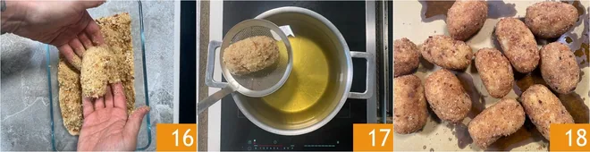 Pass the battered supplì in rustic breadcrumbs 16 and proceed in this way to form all the others; with these doses, you will get about ten. You are ready to fry: gently dip 1-2 supplì at a time into the oil at a temperature of 320°F 17 and fry for about 4 minutes until golden and crispy. Drain on paper towels 18 and enjoy your cacio e pepe supplì while still hot!