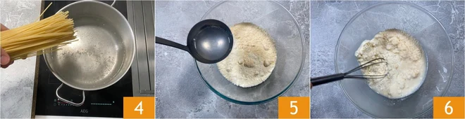 In the meantime, bring a pot of lightly salted water to a boil and cook the tonnarelli until al dente 4. Pour a ladle of the cooking water into a bowl where you have previously mixed the grated pecorino and Parmigiano 5, then mix vigorously with the whisk 6.