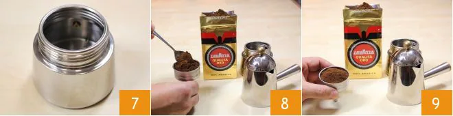In the meantime, prepare the coffee with the coffee maker: to obtain excellent coffee, fill the boiler of your coffee maker with cold, low-limescale water, taking care not to exceed the safety valve 7 (otherwise you will get a longer coffee). Fill the filter with ground coffee forming a small mound that you will level by tapping the filter on the table with firm movements (8-9). Do not press with a spoon or make holes on the surface.