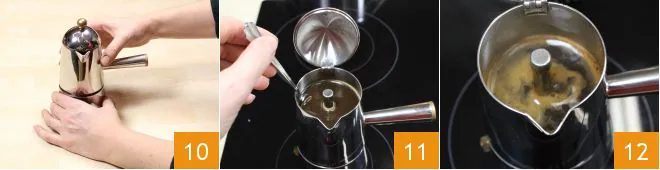 Close the coffee maker very tightly 10, so that the coffee doesn't come out from the sides while it rises, and place it on a low, steady flame to obtain a strong coffee. As the coffee rises, a dense foam will form 11: we recommend not letting the coffee gurgle for too long to keep its sweetness and aroma intact. Your coffee is ready: before using, stir it directly in the moka with a teaspoon to make the coffee more homogeneous 12.