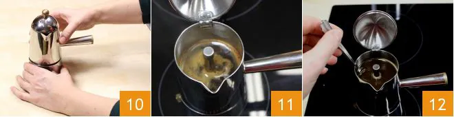 Screw the coffee maker tightly 10 (to prevent the coffee from leaking from the sides while rising), then place it on a low and steady flame, to obtain a full-bodied coffee. As the coffee rises, a dense froth will form 11; we recommend not letting it bubble too long, to maintain its aroma and sweetness. Your coffee is ready: before pouring, stir it directly in the moka with a teaspoon, to make it more homogeneous 12.