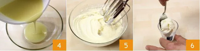 Transfer the obtained mixture to a bowl and place it in the refrigerator to cool for 34 hours 4; after the indicated time, remove it from the refrigerator and whip it using electric beaters 5. Now take a spoonful of ganache and spread it on the side of a medium glass 6.