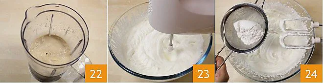 Blend all the ingredients until you get a smooth cream. Before transferring the cream to the glass, prepare the whipped cream. You can consult this procedure by consulting the cooking school card: How to Whip Cream. Then pour the well-chilled fresh liquid cream into a large bowl and with cold beaters of an electric mixer, whip the cream to stiff peaks 23. At this point, add the sifted powdered sugar 34 and incorporate it into the cream with a spatula mixing from the bottom up to avoid deflating.