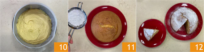 Level it 10 and bake in a static oven at 340°F for 30-35 minutes. Let it cool, remove from the mold, and decorate with powdered sugar 11. Your cake without yeast is ready to be enjoyed 12!